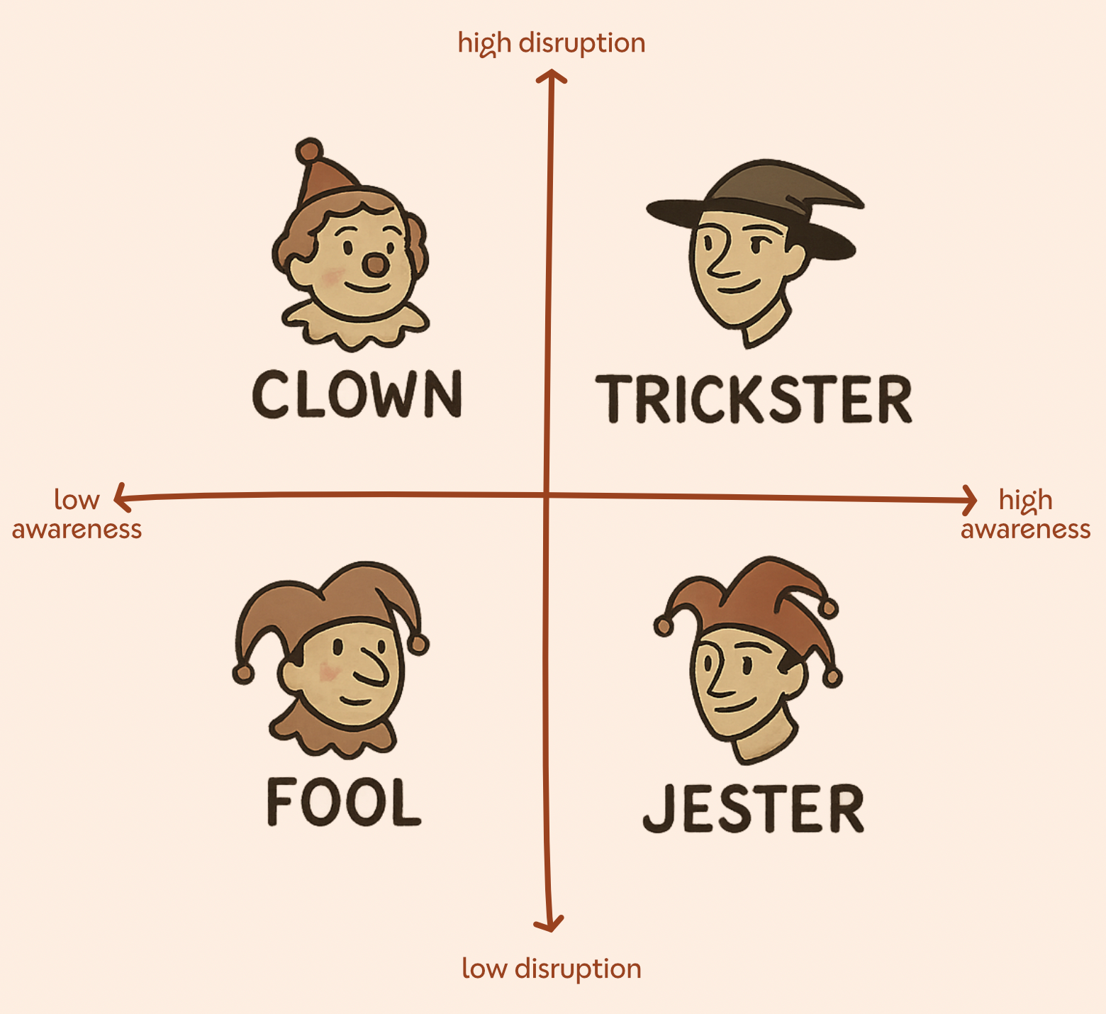 Whilst I respect the role, I’m still not sure how I feel about clowns. Whereas the disruptions of tricksters and jesters are subtle and intentional, the fool and the clown don’t harbour the same level of awareness. But at least with the fool, fewer people get hurt.